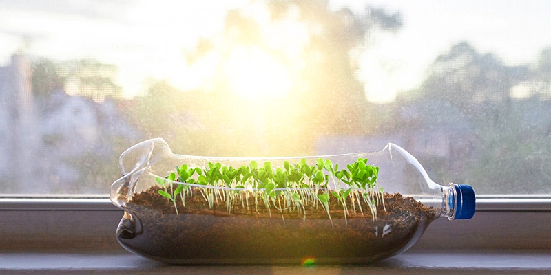 10. Botellas de plástico. Las botellas de plástico son otro elemento a tener en cuenta al momento de reutilizar, sobre todo, por la cantidad que abunda en el planeta. Las botellas hechas de tereftalato de polietileno, más conocido como PET, son las mejores, ya que no usan el Bisfenol A como aditivo. Algunas maneras en que se puede reusar las botellas de plástico son: macetas para cosechar tomates, guardar aditivos, construcción de sistemas de riego,etc.